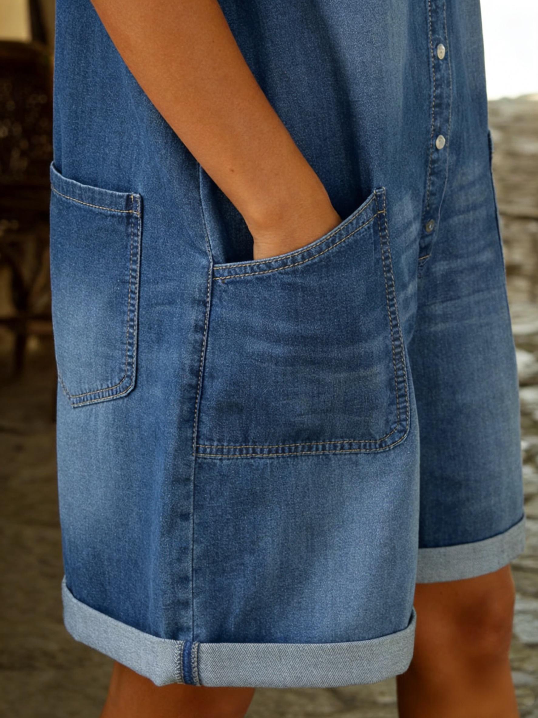 Mono, Corto, de, Mezclilla, para, Mujer, con, Bolsillos, Mangas,Cortas, Estilo, Casual, Chic, para, Primavera, 2026, Disenio, Holgado, y,Versatil, Ideal, para, Looks, Urbanos, y, Vacaciones.