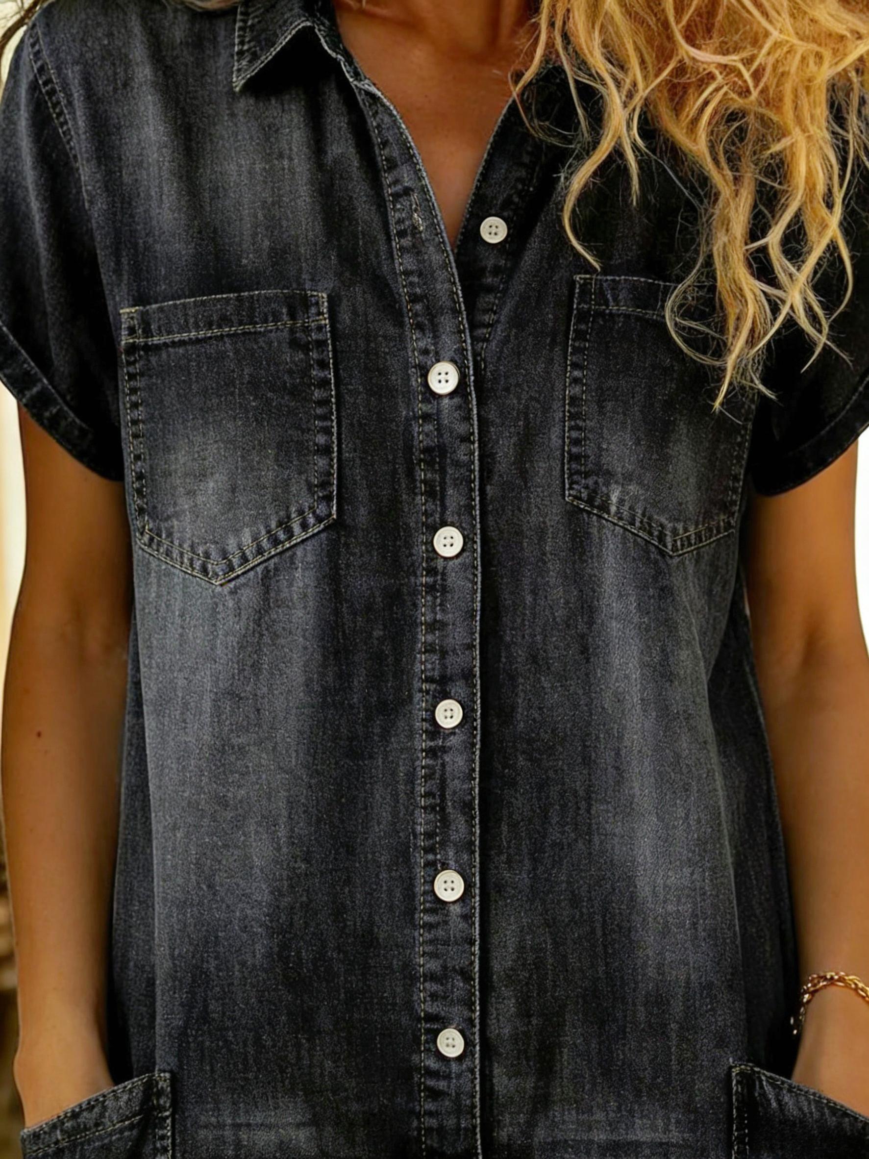 Mono Corto de Mezclilla para Mujer, con Bolsillos, Mangas Cortas,Estilo Casual Chic, para Primavera 2026, Diserio Holgado y Versatil,Ideal para Looks Urbanos y Vacaciones, Color Negro.